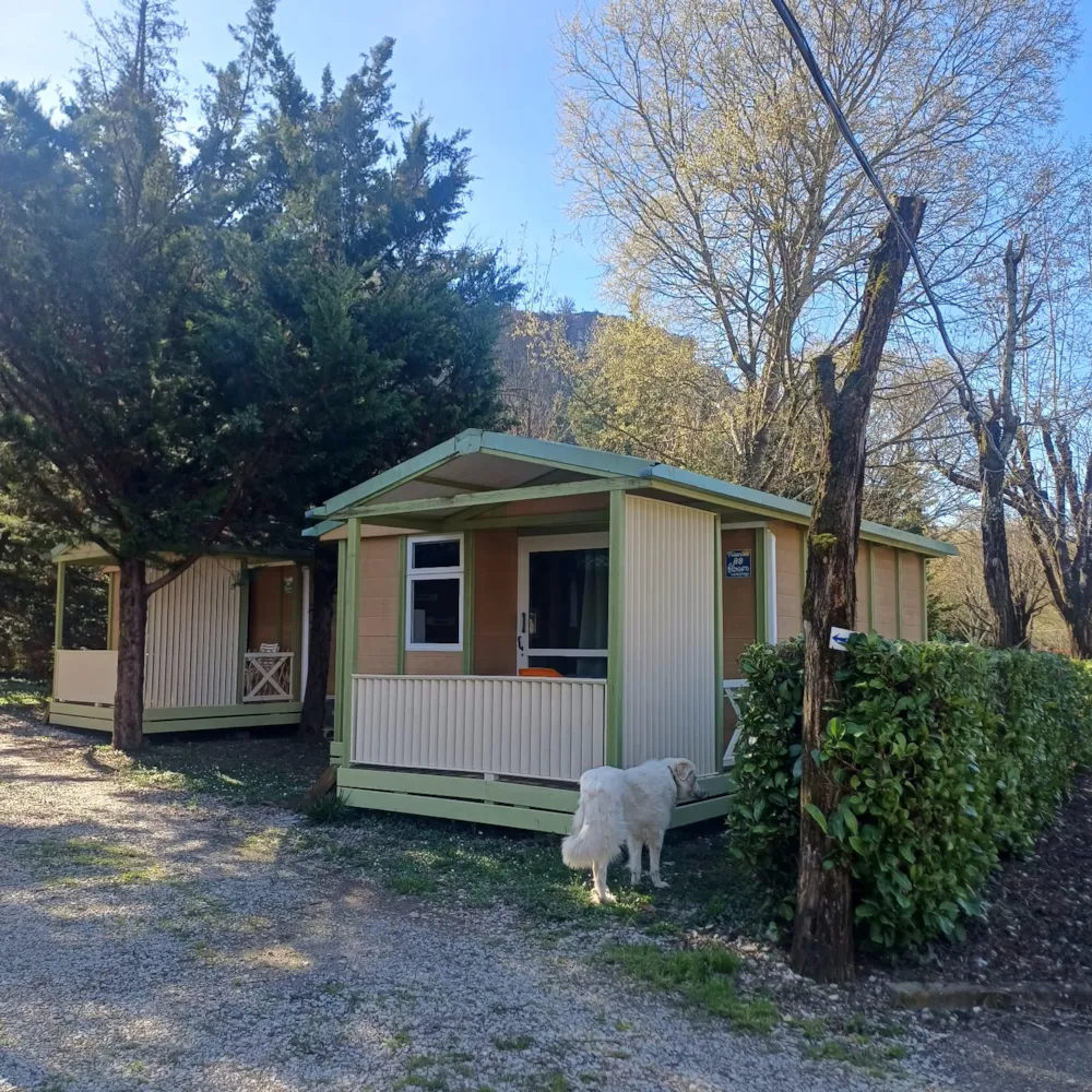 Chalet TINY 20 m², avec terrasse couverte, 1 chambre, oreillers et couettes fournis. Chambre : lit de 140 x 200 cm. Salle à manger salon- Salle d'eau : lavabo, douche et WC Cafetière électrique et four micro-ondes Terrasse couverte avec salon de jardin et bains de soleil. Animaux acceptés avec supplément.